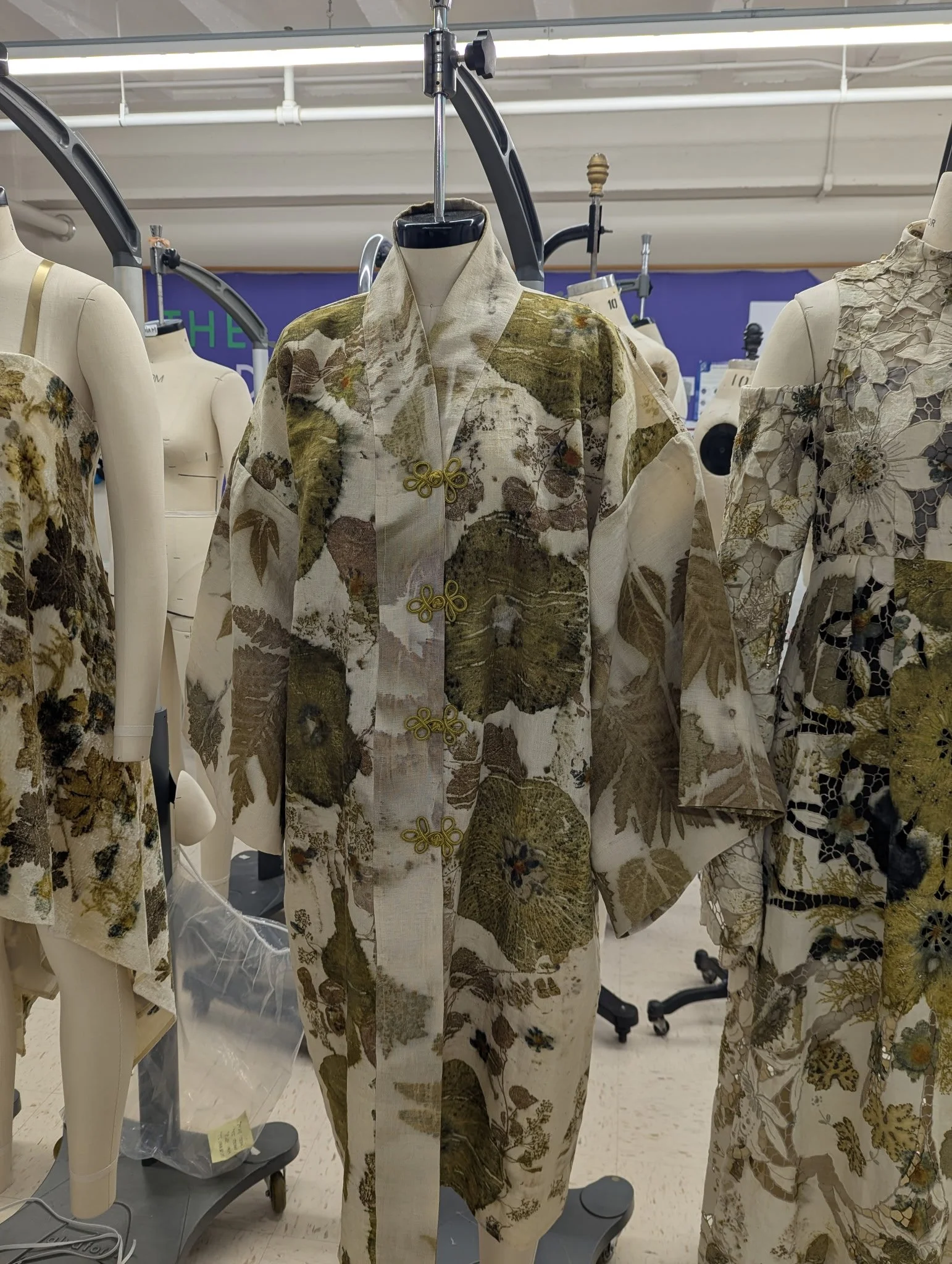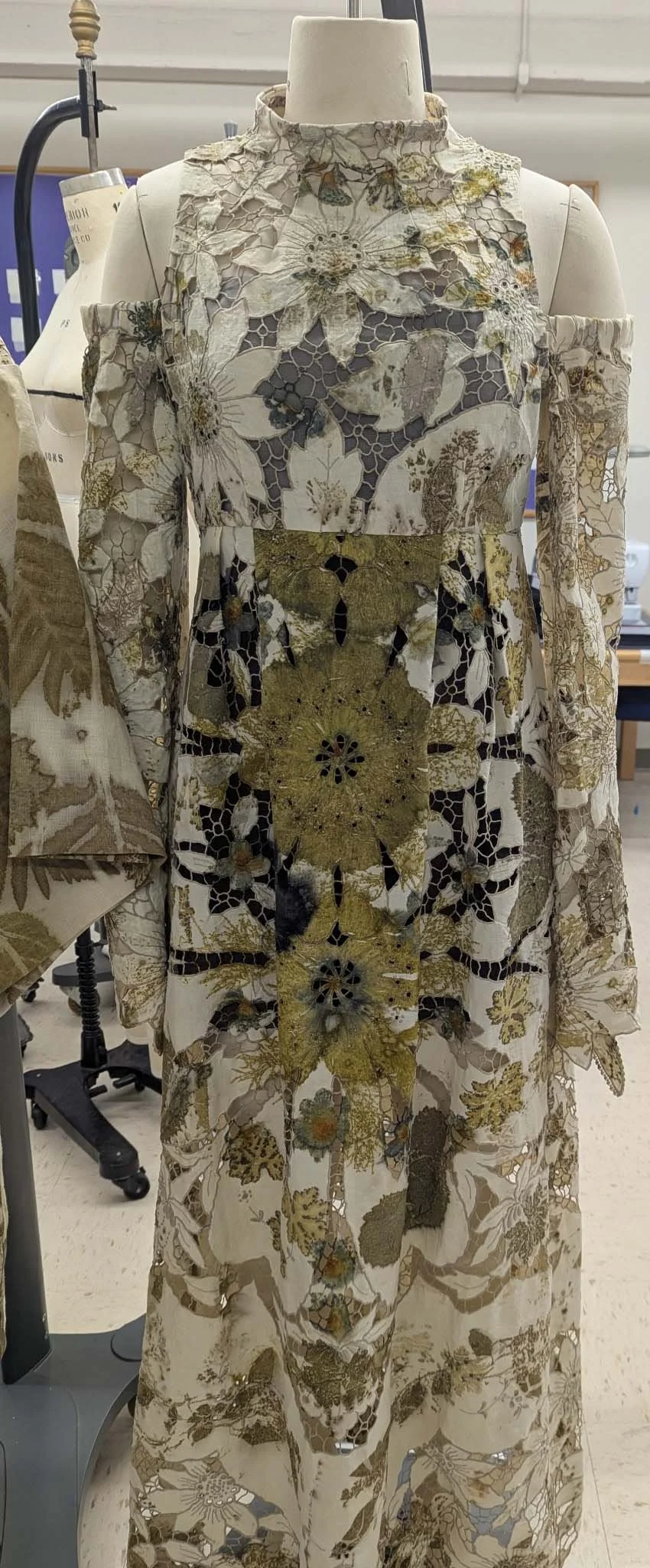 Earth Art Galleries attended an outdoor art show and met Carol Mager, St. Kate’s Fashion Department. One thing led to another and December, 2025, we received a peek at what happened, and it was fabulous. We provided the students with eco-dyed linen, silk, cotton, velvet, organza and even an antique lace tablecloth. They used the fabric and their design skills to create beautiful clothing.